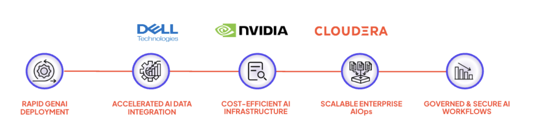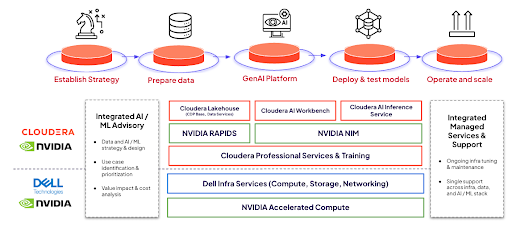 Cloudera와 Dell, 그리고 NVIDIA는 최첨단 하드웨어 혁신과 운영 간소화를 결합한 완전 관리형 서비스를 통해 기업이 AI 시대를 빠르게 선도할 수 있도록 지원합니다. AI를 구동하기 위해 레거시 인프라를 억지로 활용할 필요가 없습니다. Dell의 최신 고성능 PowerEdge 서버, NVIDIA의 가속 컴퓨팅, NVIDIA RAPIDS, NVIDIA NIM, 그리고 Cloudera AI를 통해 데이터가 가진 잠재력을 온전히 이끌어낼 수 있습니다. 이 모든 기술이 결합되어 효과적이고 효율적인 데이터 파이프라인을 구축하여, 턴키형 엔터프라이즈 AI 솔루션을 완성합니다.