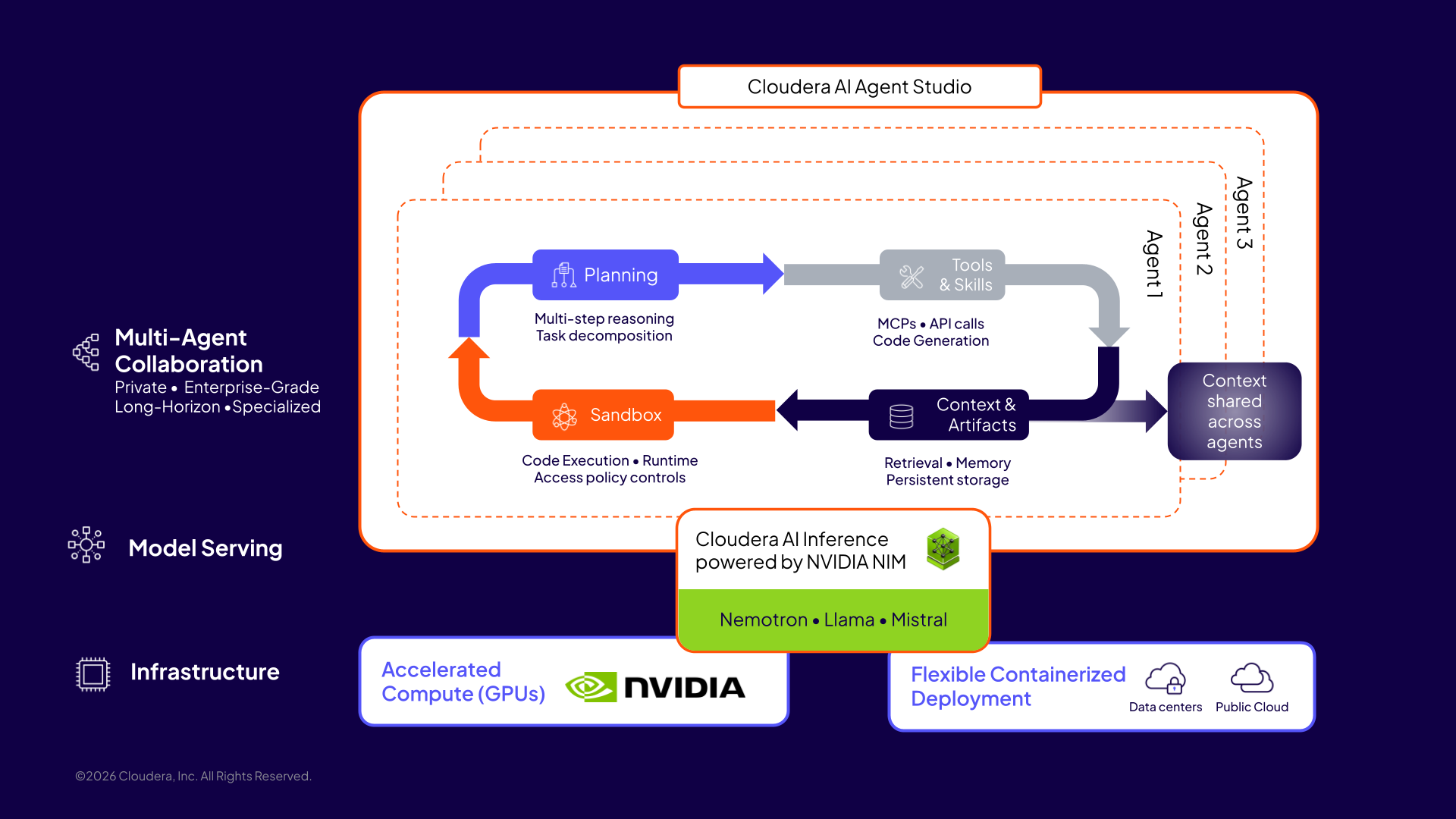 그림 1. Cloudera Agent Studio는 반복적인 다단계 계획 수립, 도구와 스킬을 활용한 멀티 에이전트 협업, 아티팩트 기반 컨텍스트 엔지니어링, 샌드박스 실행을 통해 자율형 워크플로를 오케스트레이션합니다. 이러한 구조는 NVIDIA NIM으로 구동되는 Cloudera AI Inference의 모델 서빙과 에이전트 기반 AI를 위한 Nemotron 모델을 기반으로 구축됩니다.